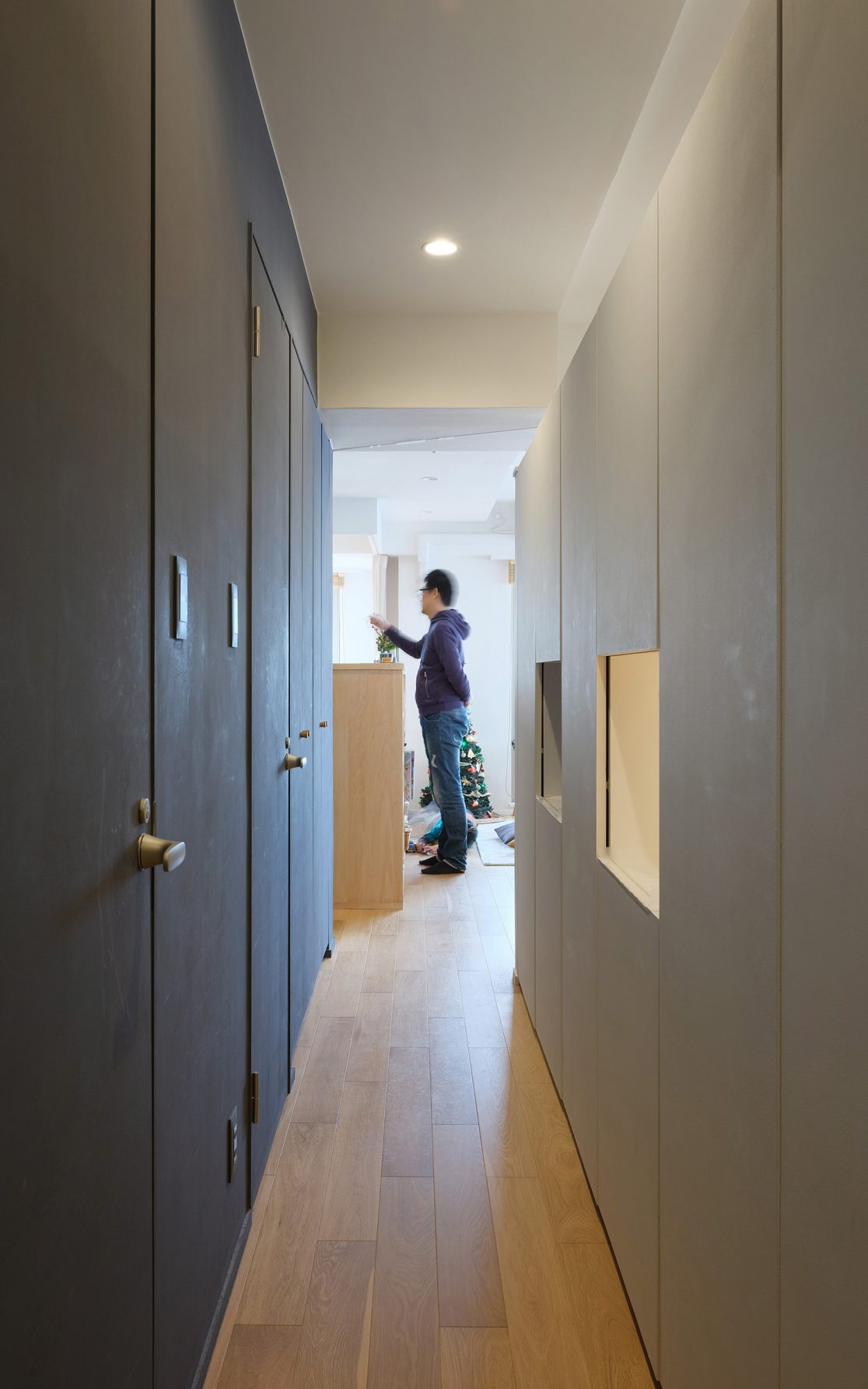 分譲マンションのリノベーションです。夫婦と子供4人の6人家族の為の空間をつくりました。限られた広さの中で、食事をする場所や寝る場所、勉強する場所、リラックスする場所、ひとりになる場所、来客を招く場所、収納をする場所、飾る場所など多くの居場所をつくりだすために、ロフト状の2層ボックスを部屋の中につくり閉じる場所とオープンな場所を明確にしつつ、回遊性のある間取りとすることで広さと長さを確保しました。