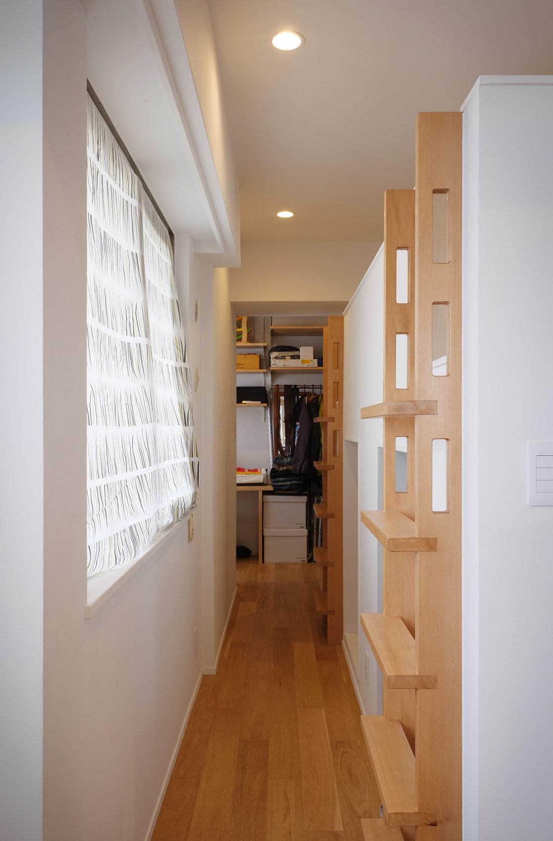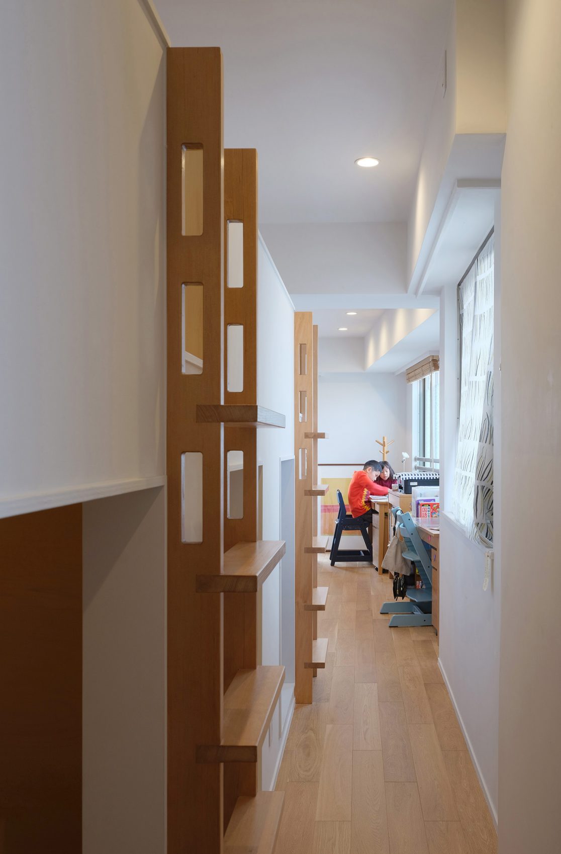 It is renovation of condominium. We created a space for a couple and 4 children, 6 families. Within the limited area, we have created many places such as places to eat, sleeping, studying, relaxing, leaving alone, inviting guests, storage places and decorating places. We secured the size and length by making a lofty two-layer box in the room, clarifying the place to close and the open place and making it a migratory floor plan.