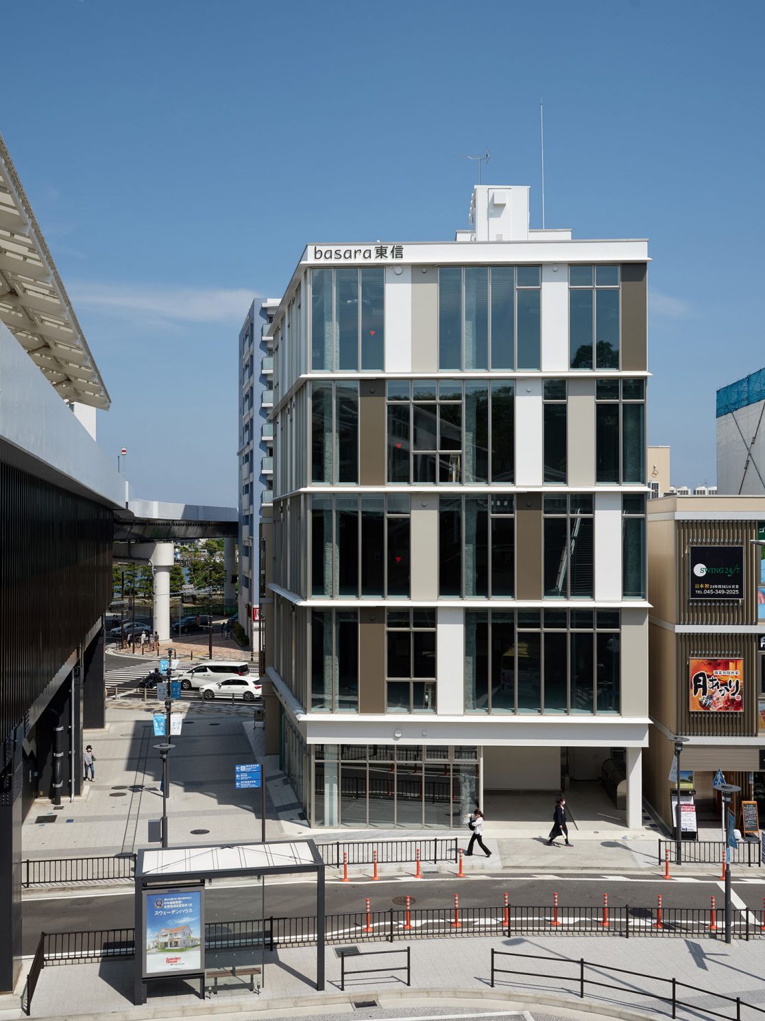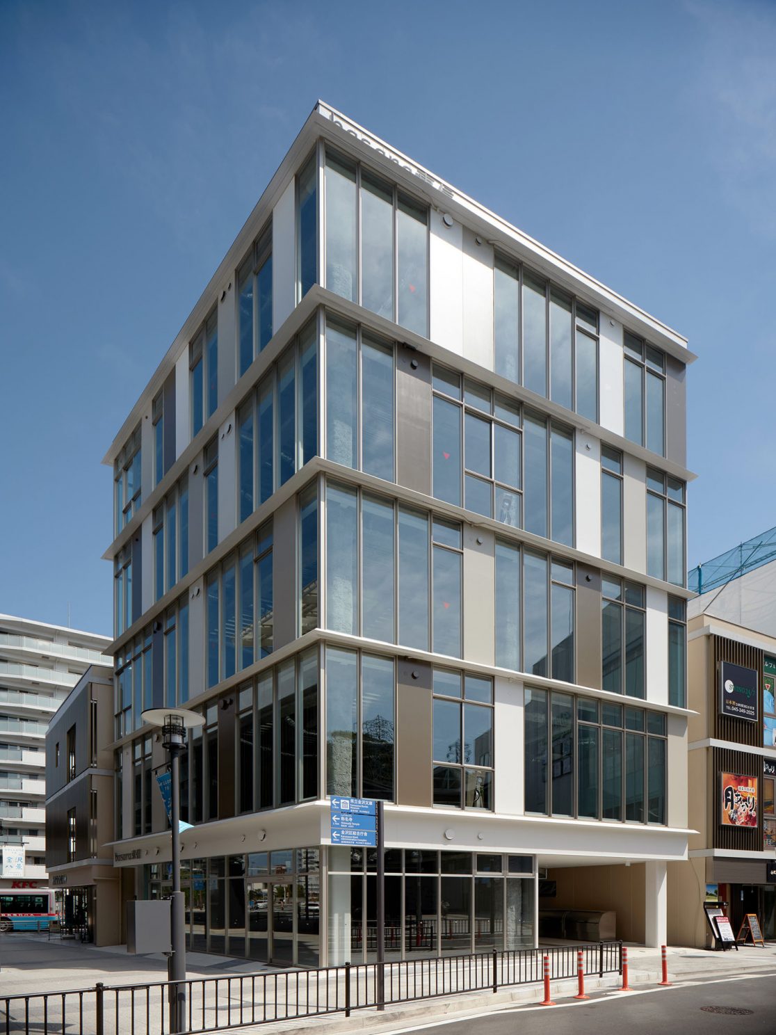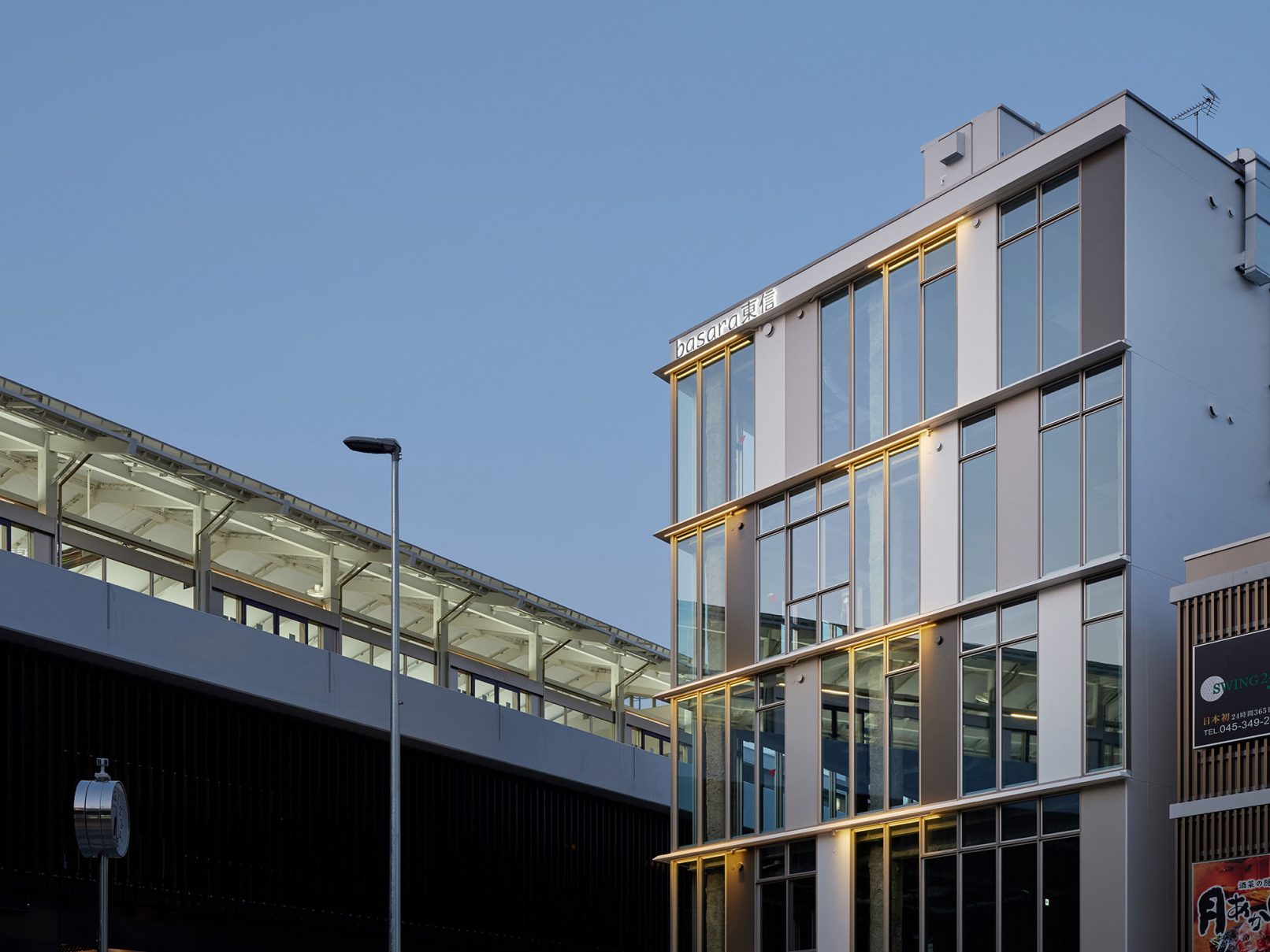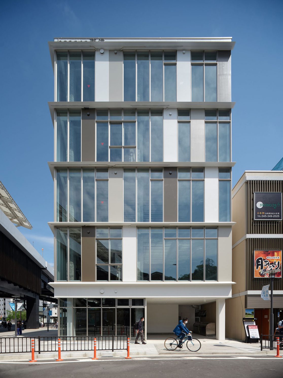 横浜市金沢区の金沢八景駅前に建つオフィス・飲食ビルです。駅前の再開発に伴う新たな区画割りが行われる中で計画が進められました。