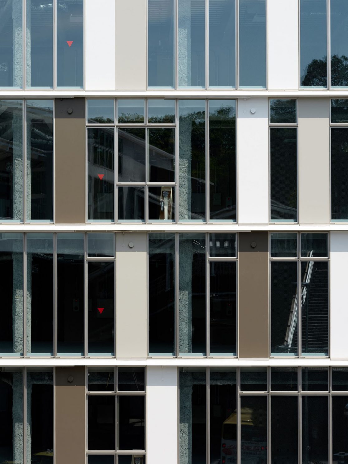 外壁と開口部をまわりの環境に合わせ慎重に計画しリズミカルに配置し、各階の層間は極限まで薄くされた水平軒によって建築に陰影の深さを与え、表情をつくりだしています。