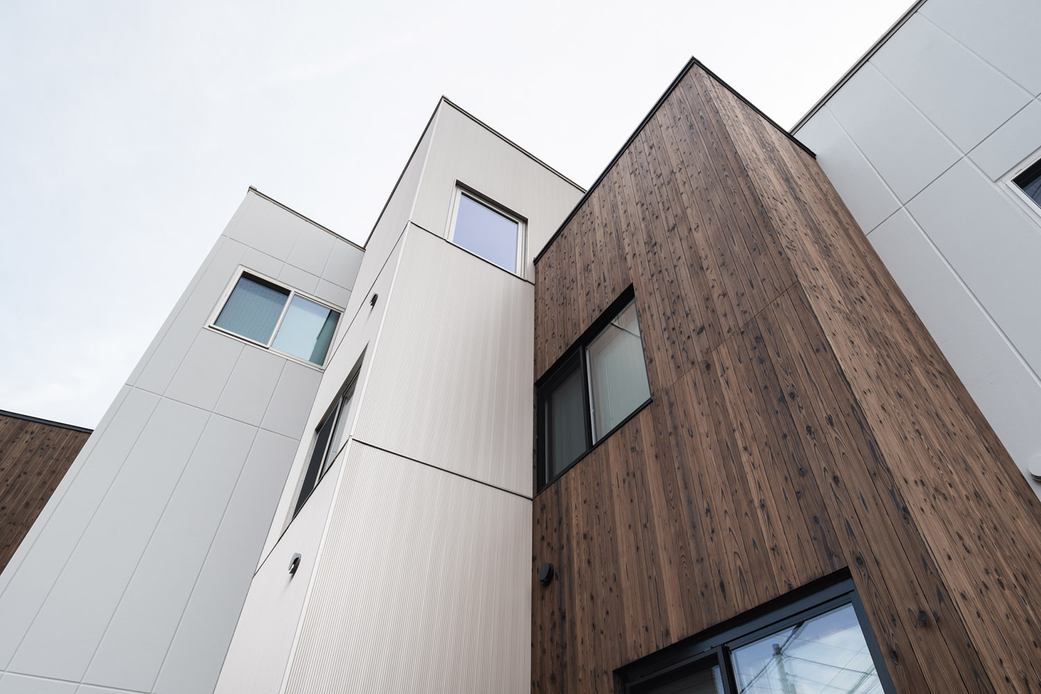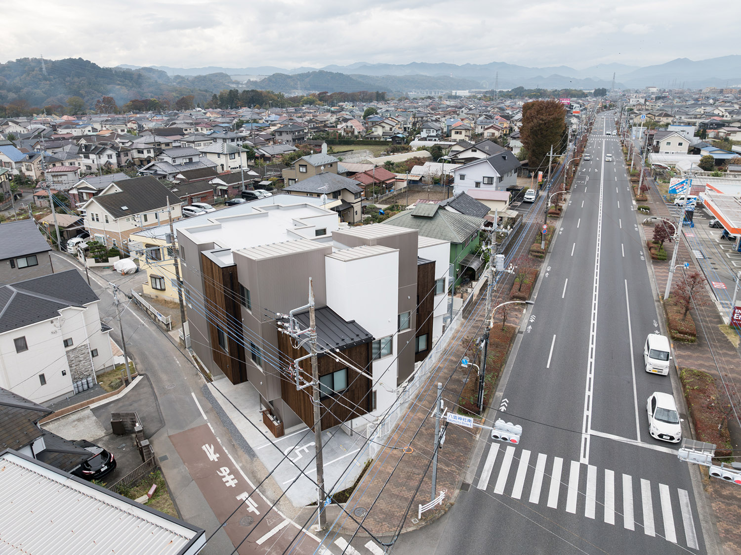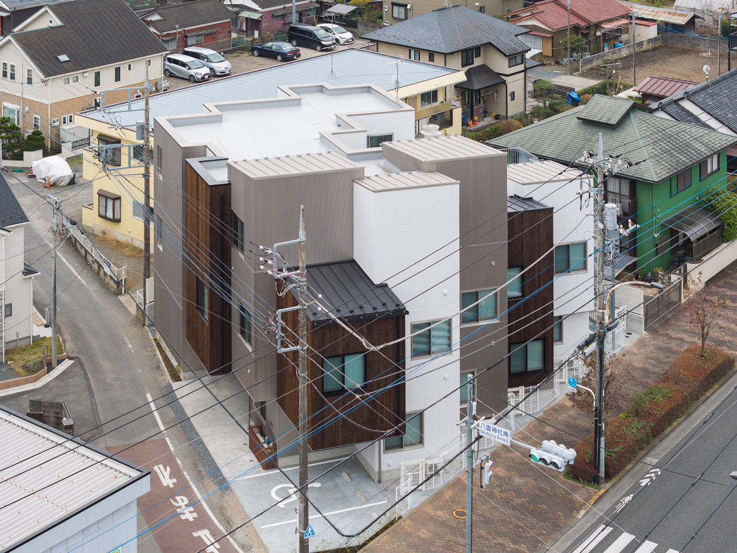 敷地は北側が交通量の多い都道、東側が住宅街へ続く細道に接し、周囲は戸建て住宅が並ぶ静かな環境です。計画では、都道の騒音対策、近隣へ日影や圧迫感を与えず生活音への配慮を行うこと、プライバシーを確保しつつ入居者が解放感を得られることが求められました。