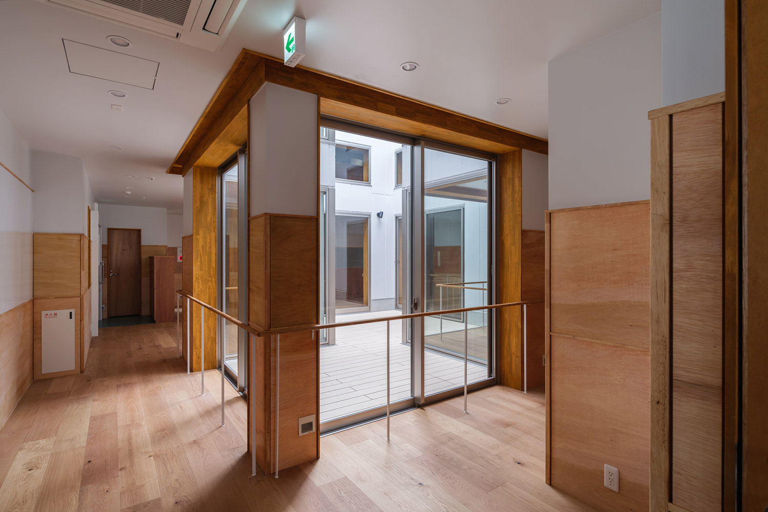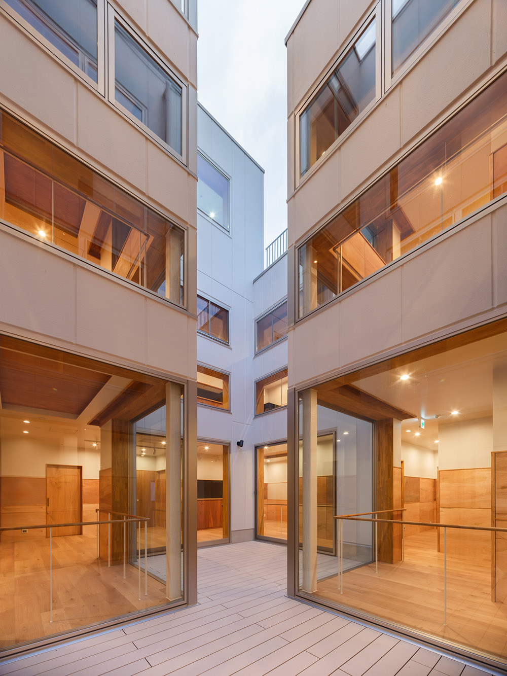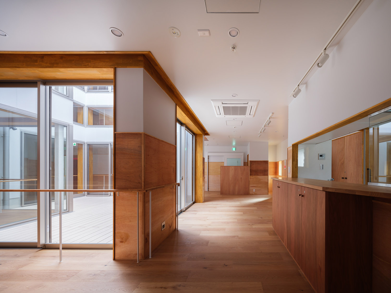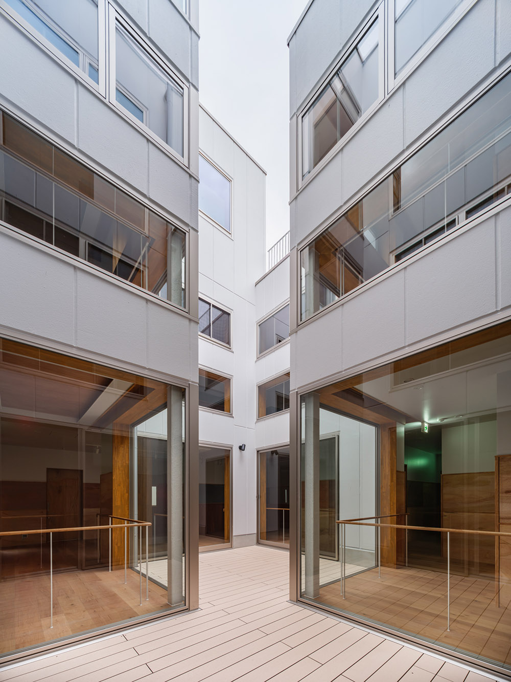 典型的な直線型ユニットを避け、中庭を囲む雁行配置を採用しています。各居室は一つひとつ異なり、たまり場や“ひみつ基地”のような小空間が生まれることで、個性ある居場所や回遊性のある動線、中庭を介した奥行と変化に富む空間を実現しています。