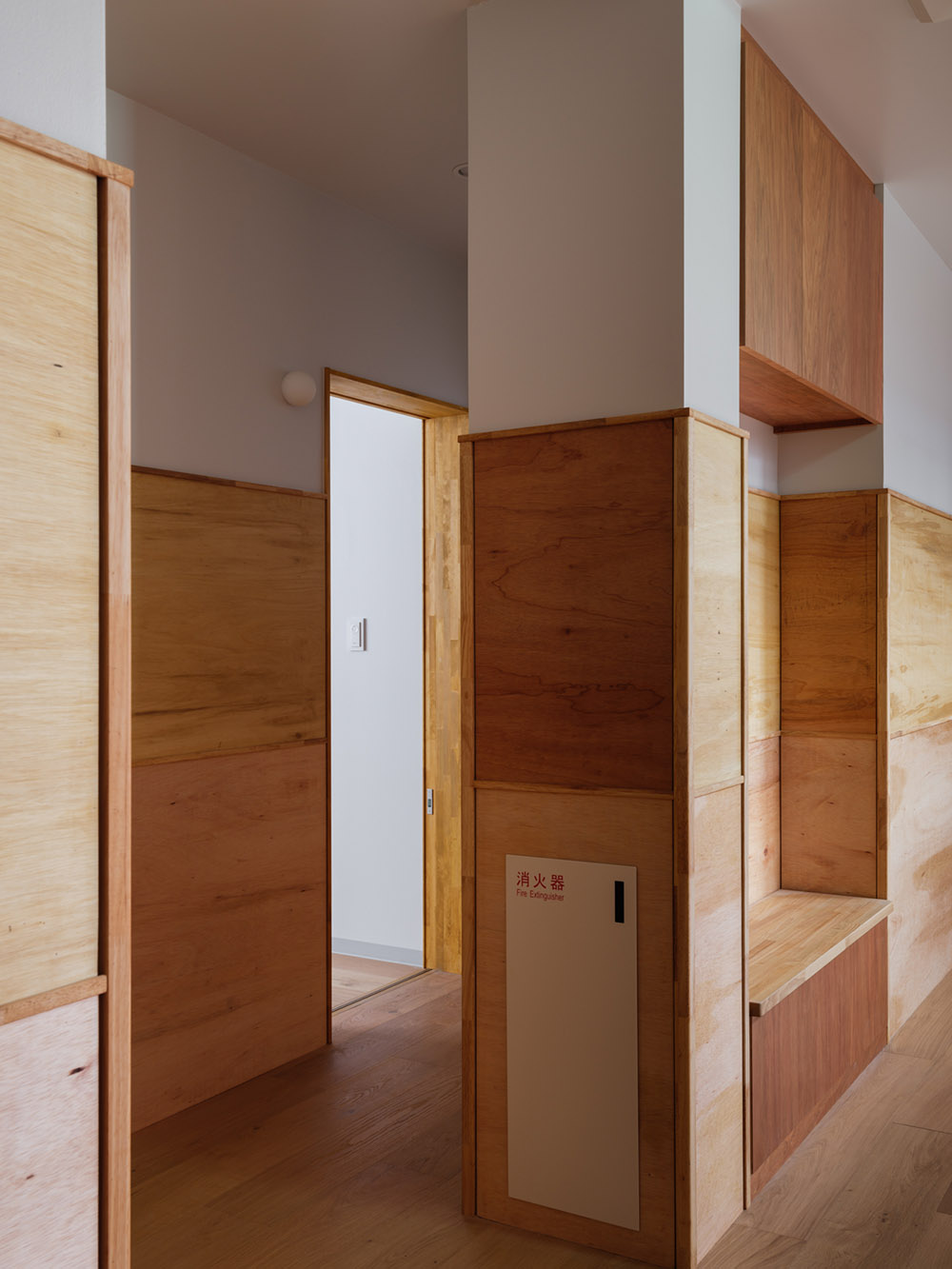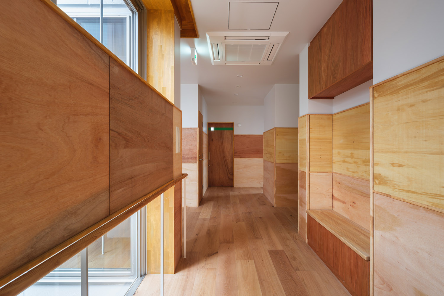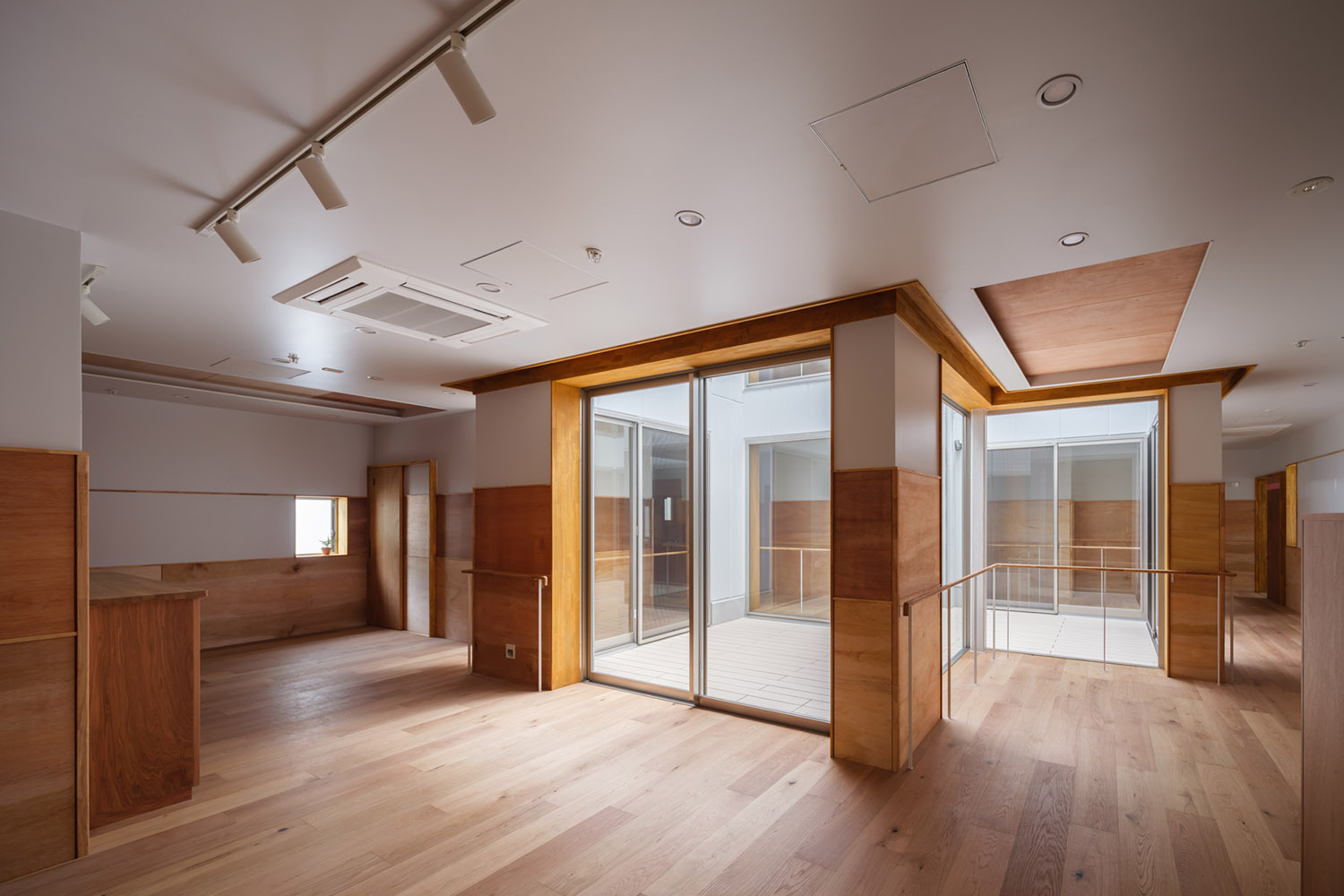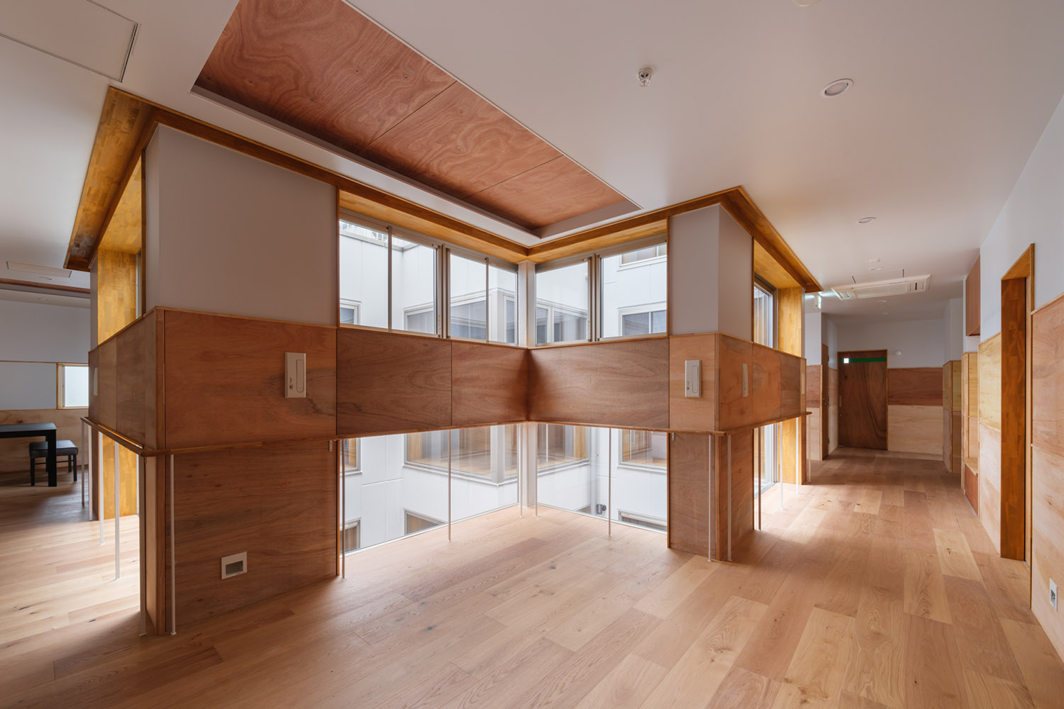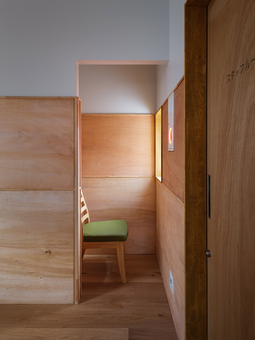 典型的な直線型ユニットを避け、中庭を囲む雁行配置を採用しています。各居室は一つひとつ異なり、たまり場や“ひみつ基地”のような小空間が生まれることで、個性ある居場所や回遊性のある動線、中庭を介した奥行と変化に富む空間を実現しています。