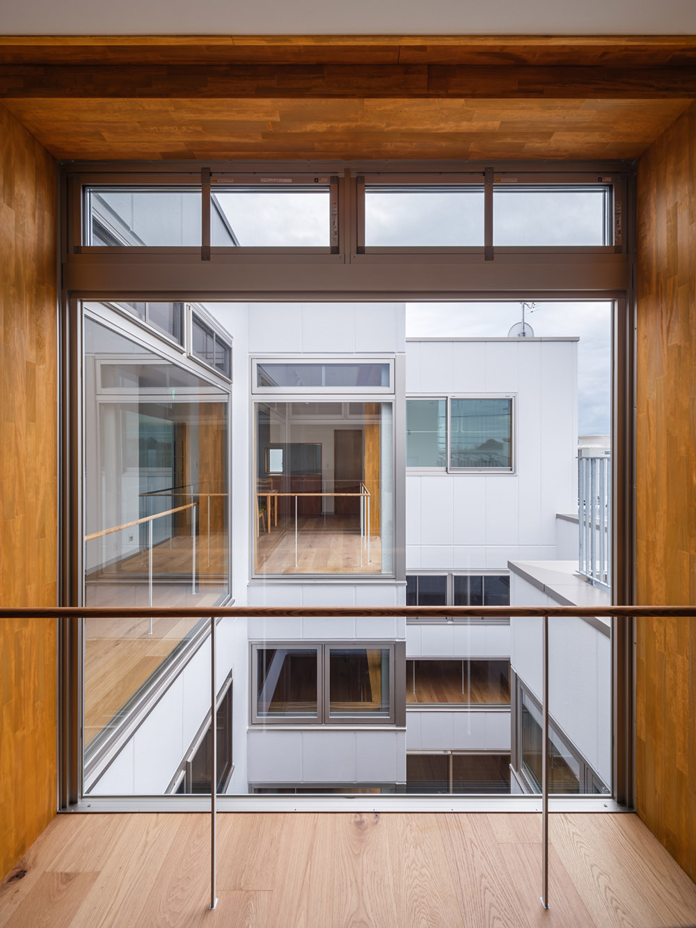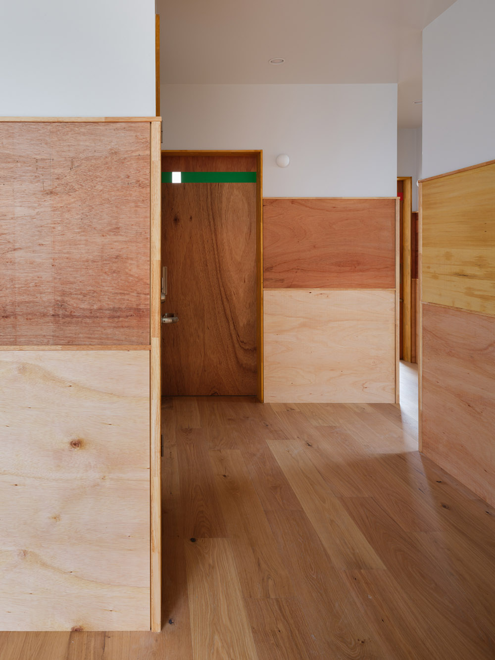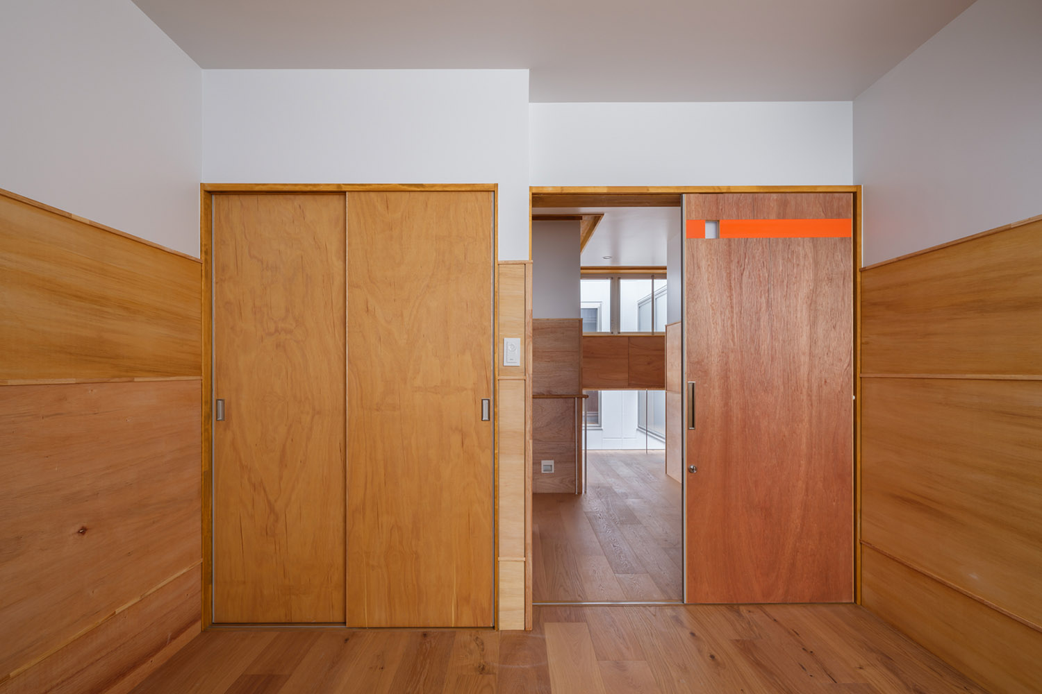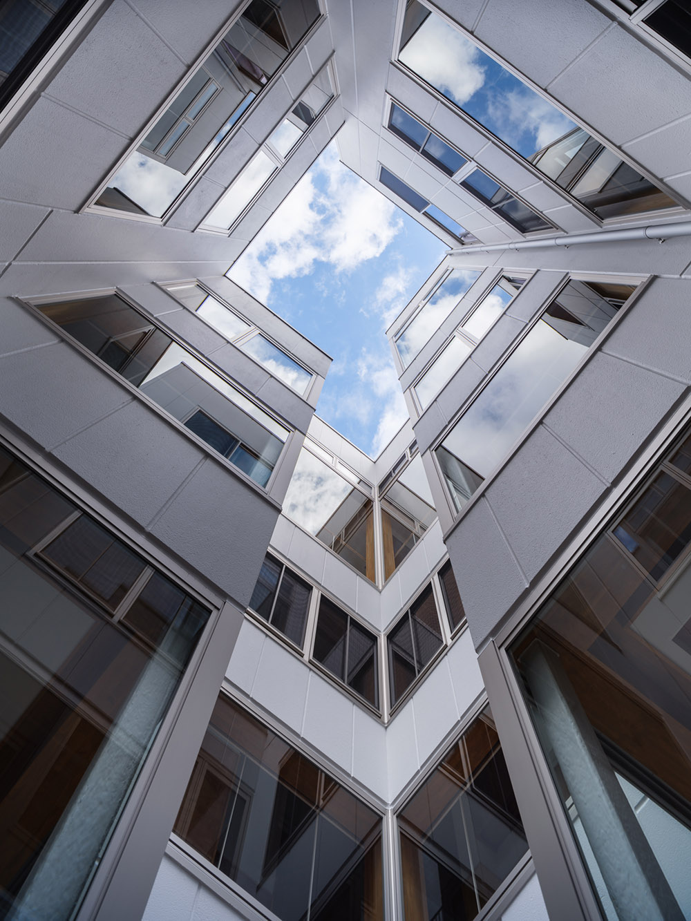 典型的な直線型ユニットを避け、中庭を囲む雁行配置を採用しています。各居室は一つひとつ異なり、たまり場や“ひみつ基地”のような小空間が生まれることで、個性ある居場所や回遊性のある動線、中庭を介した奥行と変化に富む空間を実現しています。